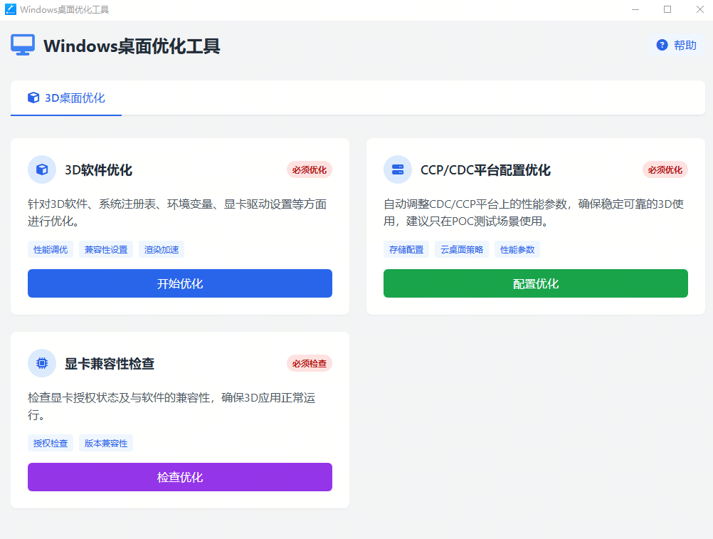 锐捷提供标准的3D预制镜像(含电力、制造、汽车等行业专用模板),并且推出了一键3D优化工具(wtool)。一键完成平台、协议、操作系统及常用3D软件的底层优化,部署时间平均节省120分钟,效率提升300%!