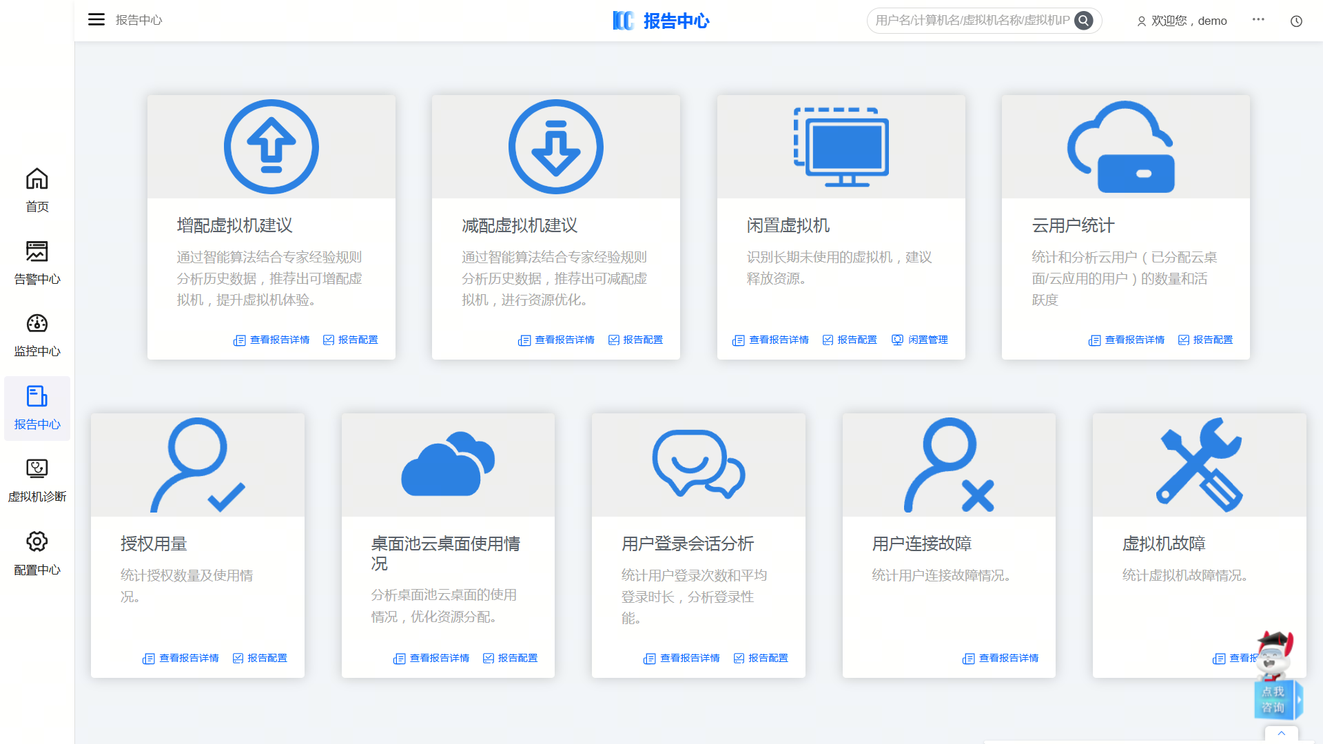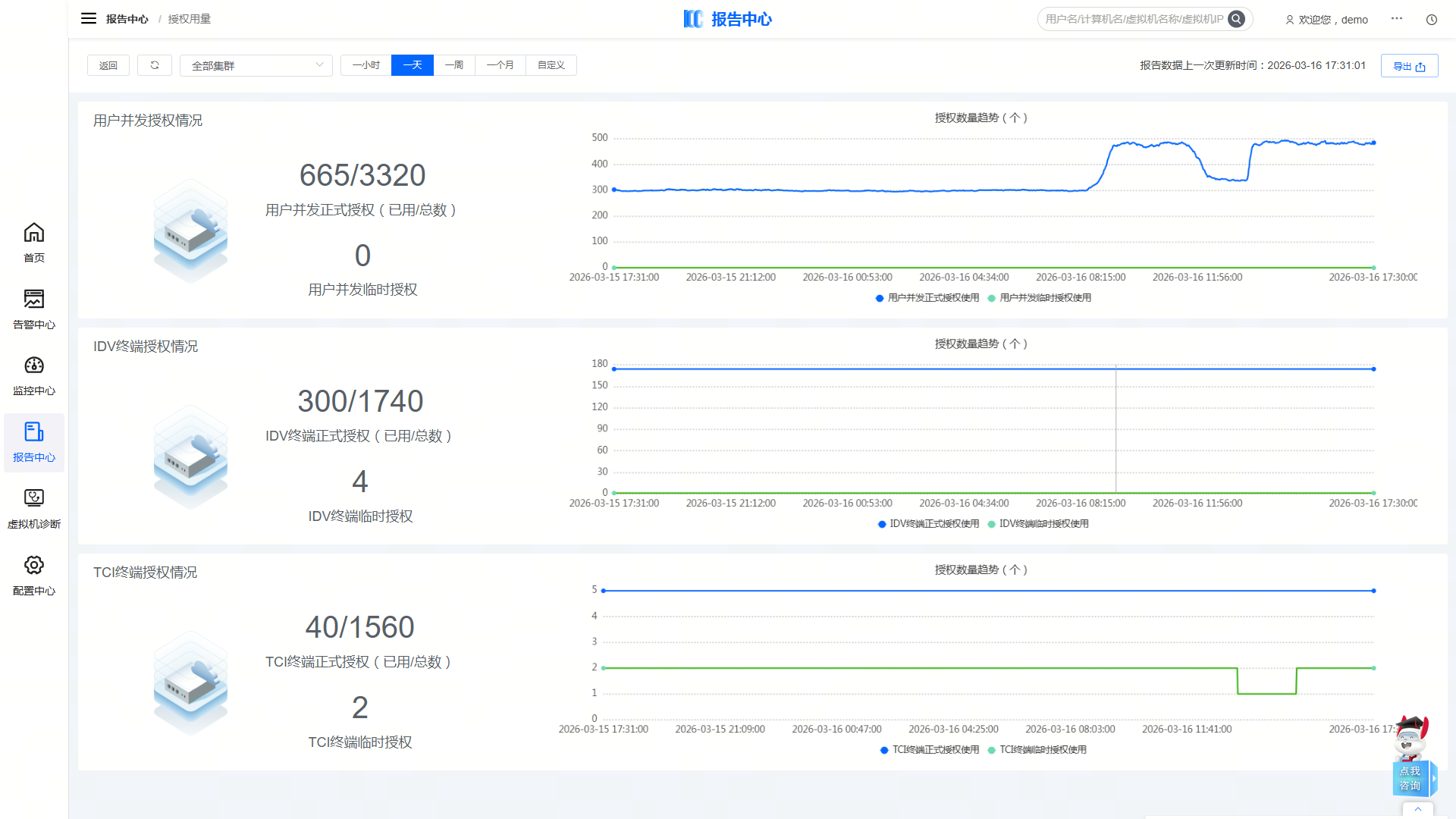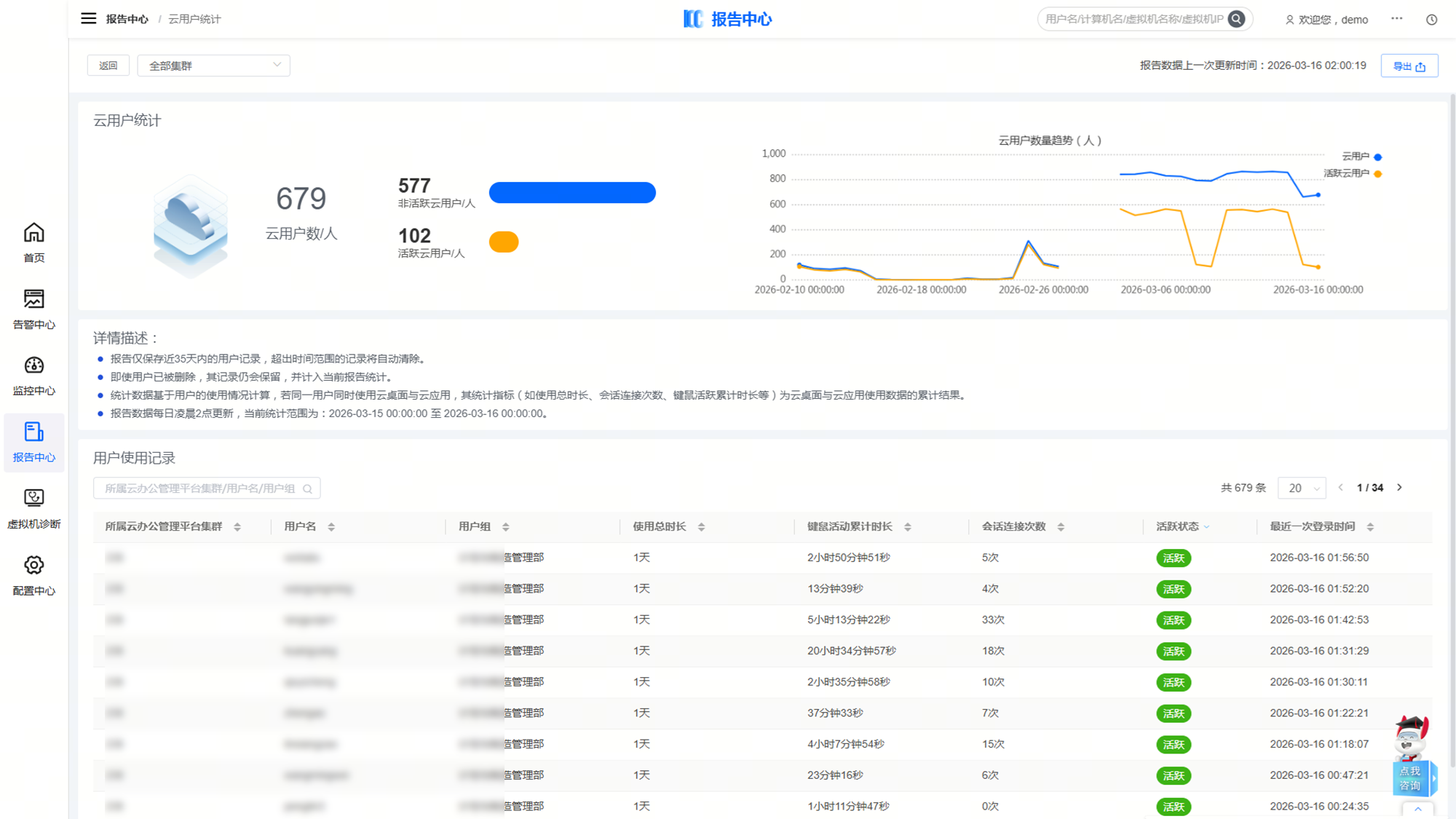 年底写总结、向领导汇报云桌面建设成果时,还在为拼凑数据头疼? 智能报表中心为你准备了丰富的武器库。你可以便捷地生成上云用户数量和活跃度报告,精准掌握活跃用户与非活跃用户比例,了解云桌面的真实推广进度。此外,平台还提供授权用量趋势分析、云桌面故障报告等多种智能报表,不仅支持自定义时间段筛选,还支持一键导出。从此,你的工作汇报不仅有理有据,更能清晰展现IT部门的运营价值!