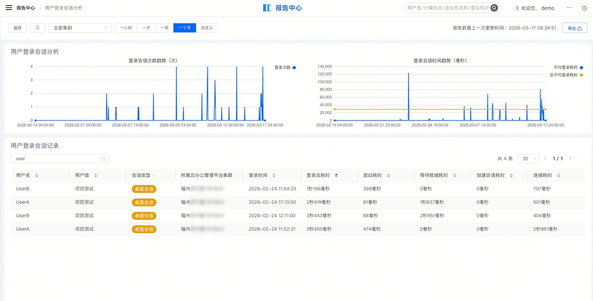 更硬核的是,针对让管理员头疼的“登录慢”问题,平台支持用户登录会话性能分析。系统会自动统计用户会话登录的平均时长,并精准记录会话连接各个阶段的耗时。卡在哪个环节,一眼便知!排查完毕后,管理员还能直接在平台上进行基础的虚机重启、会话注销、进程强制退出等运维操作,缩短运维步骤。