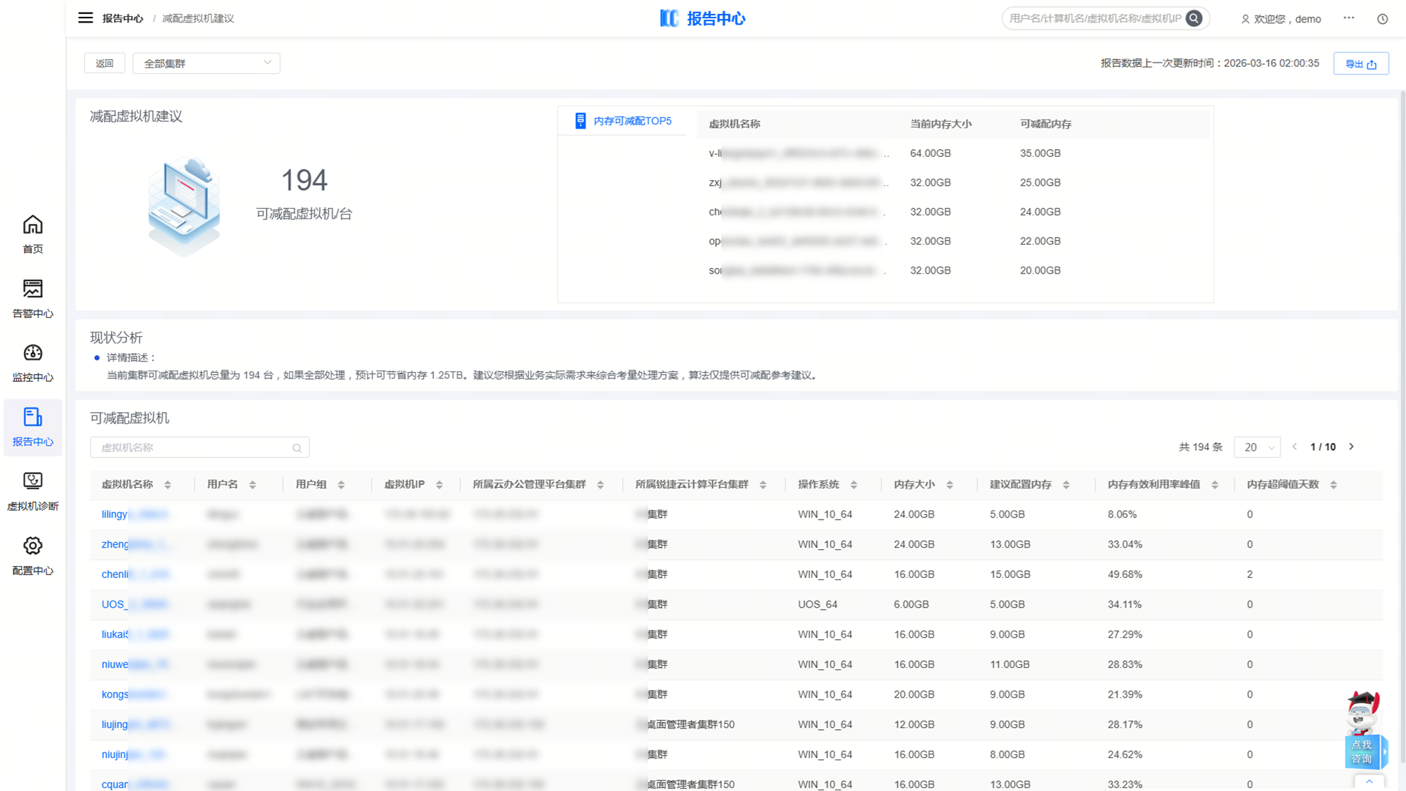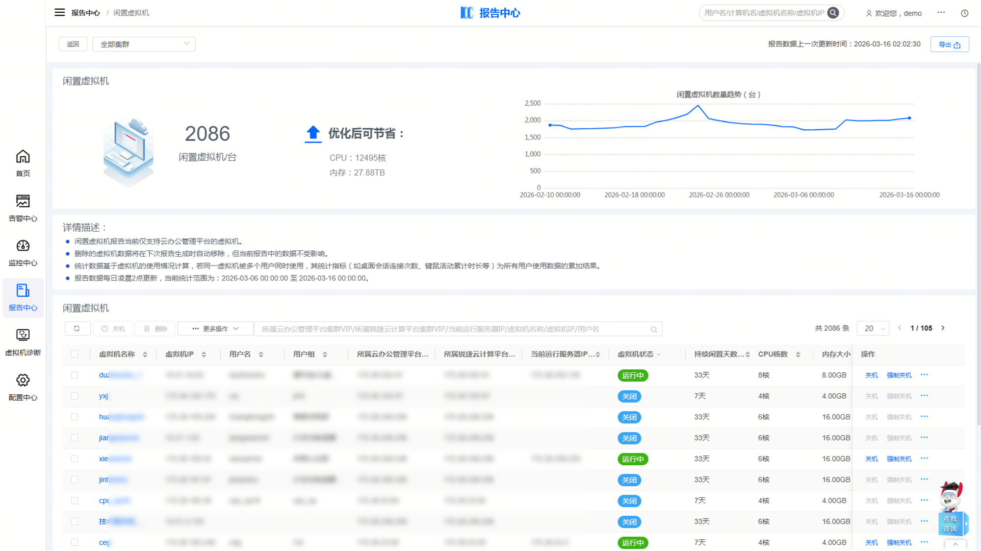 只会排障的运维不是好IT,懂运营和降本增效才是核心竞争力! 随着云桌面规模扩大,集群中难免会出现分配了却没人用的“僵尸”桌面,或者配置过高导致资源浪费的情况。 锐捷IOC不仅能监控,更能做你的智能资源管家。根据系统的运行数据配合智能算法,平台能够自动精准识别集群中的闲置虚机,并根据真实的CPU、内存等使用情况,给出科学的增配或减配建议。这能有效地帮助集群实现资源利用率最大化,实实在在节省企业的硬件投资成本。