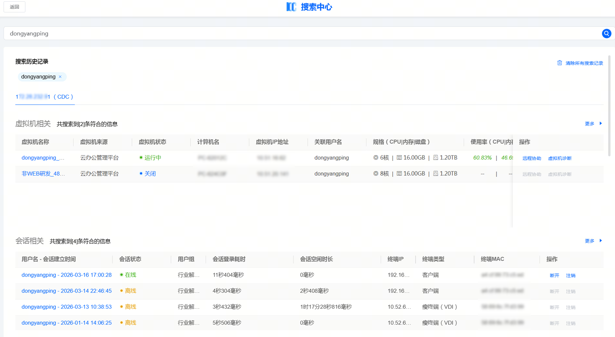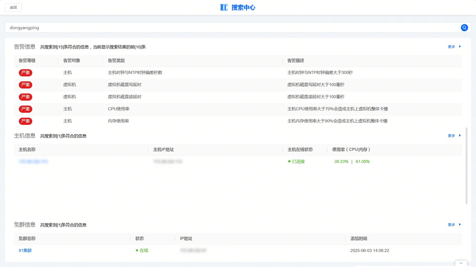 全局检索:集群、主机、虚机、会话等一站式呈现